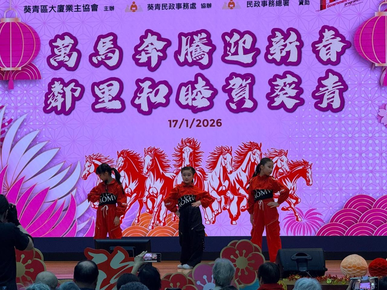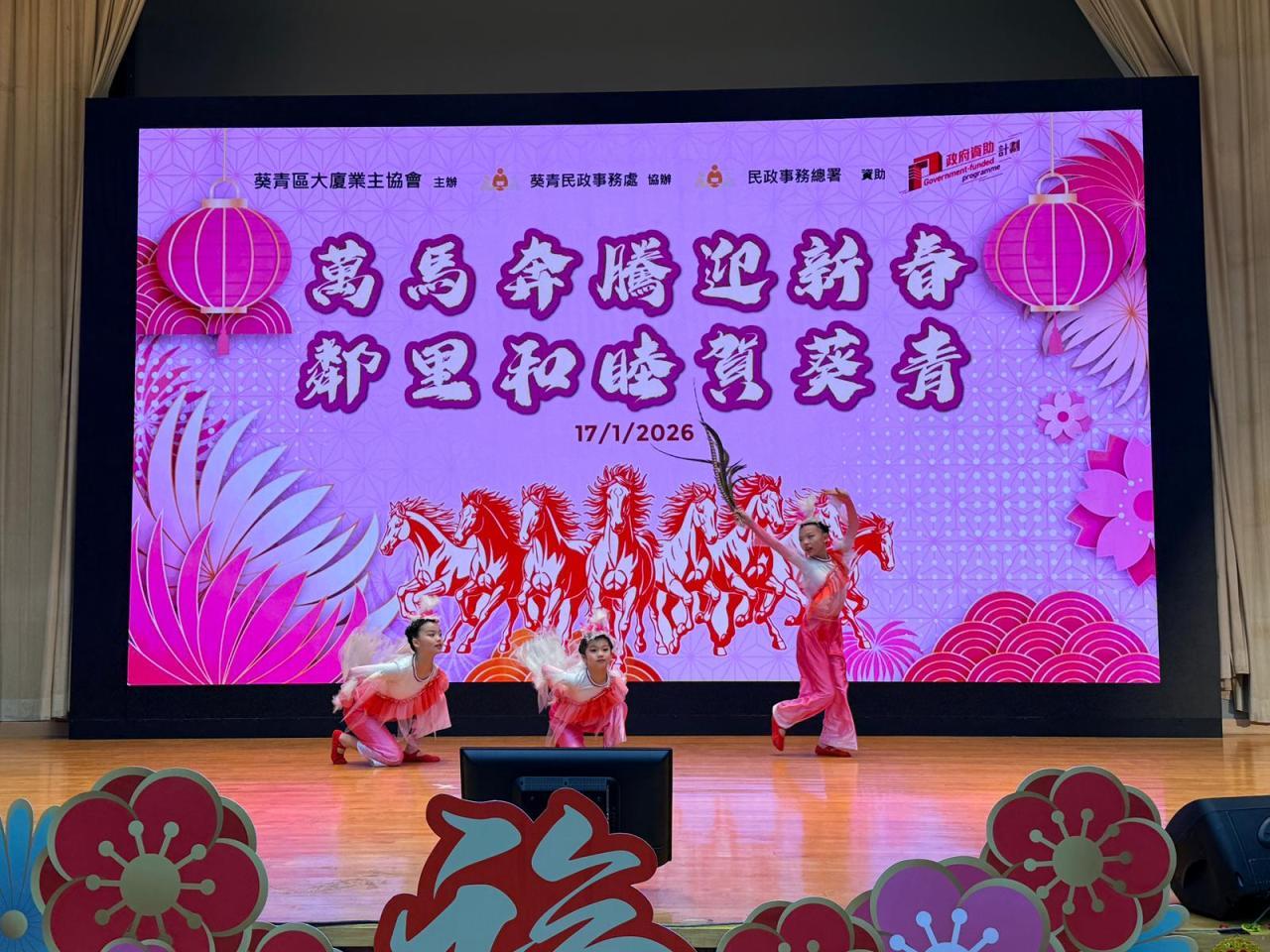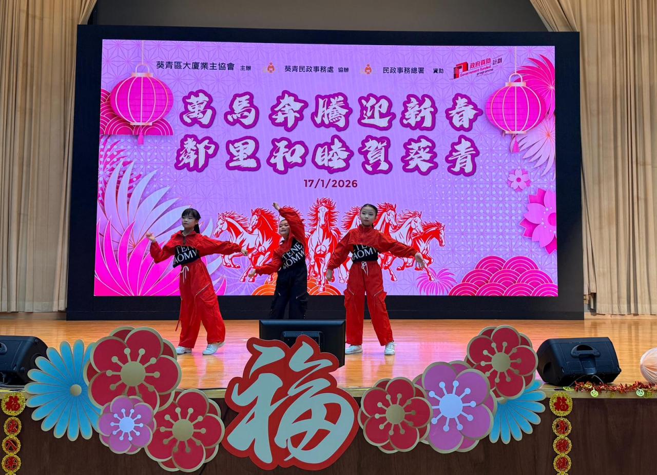 本校舞蹈組(中國舞及K-pop)受邀參與由葵青區大廈業主協會主辦、葵青民政事務處協辦、民政事務總署資助的「萬馬奔騰迎新春·鄰里和睦賀葵青」表演活動,學生於大窩口社區中心會堂向市民進行舞蹈表演。