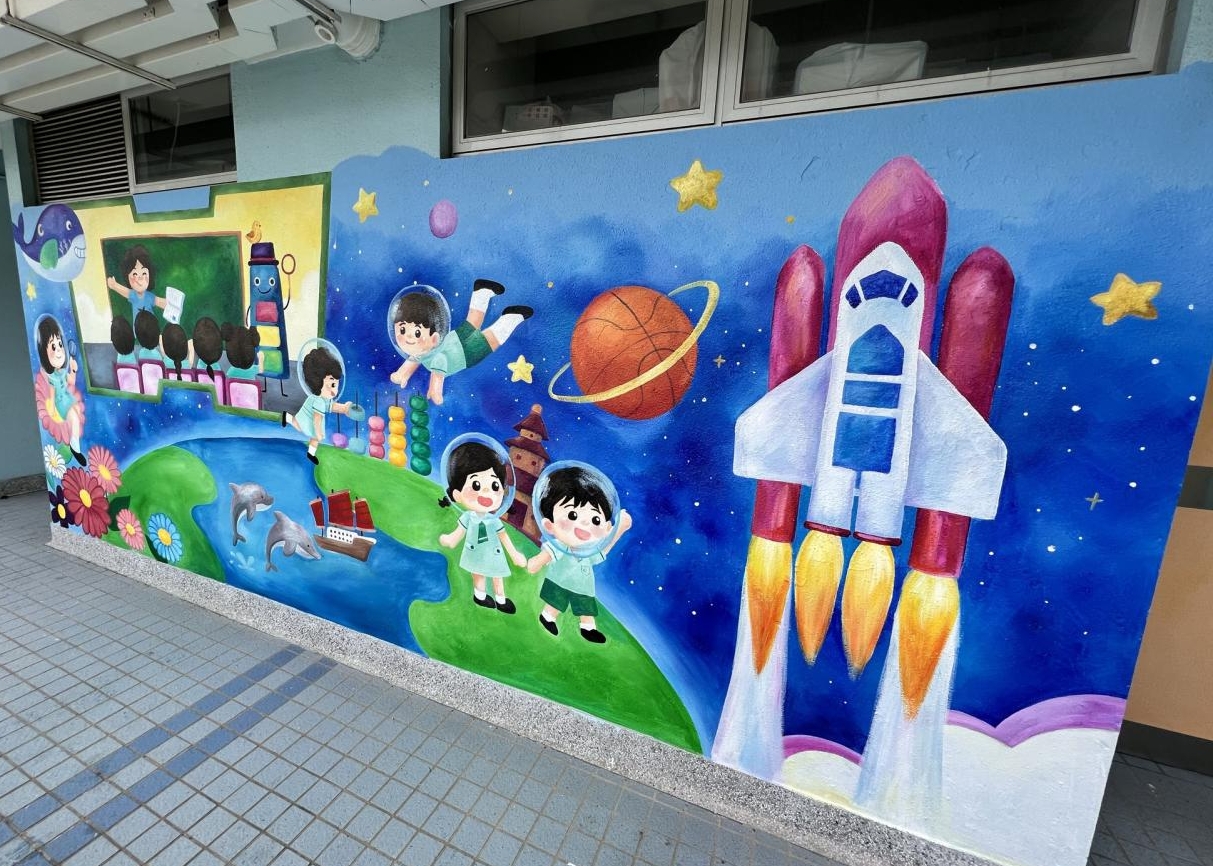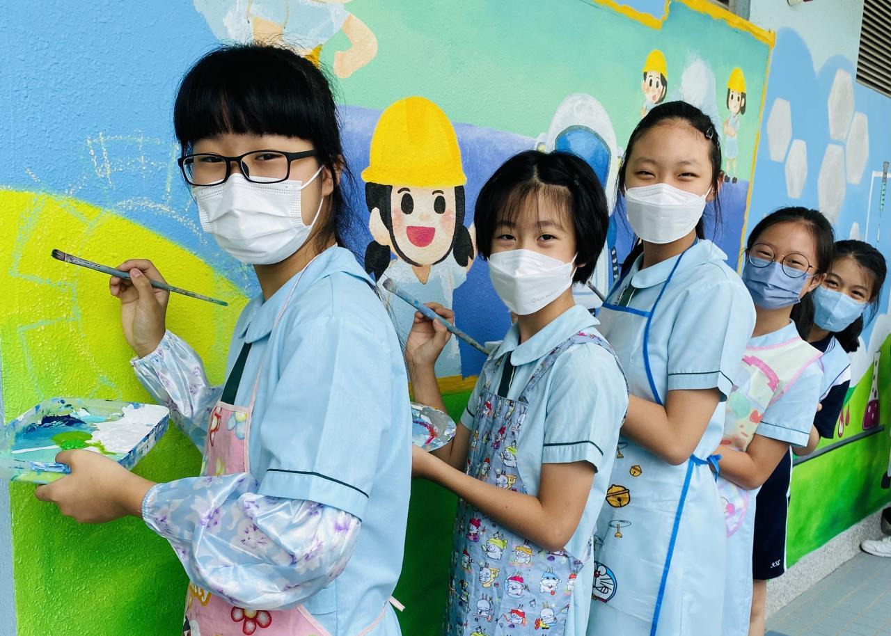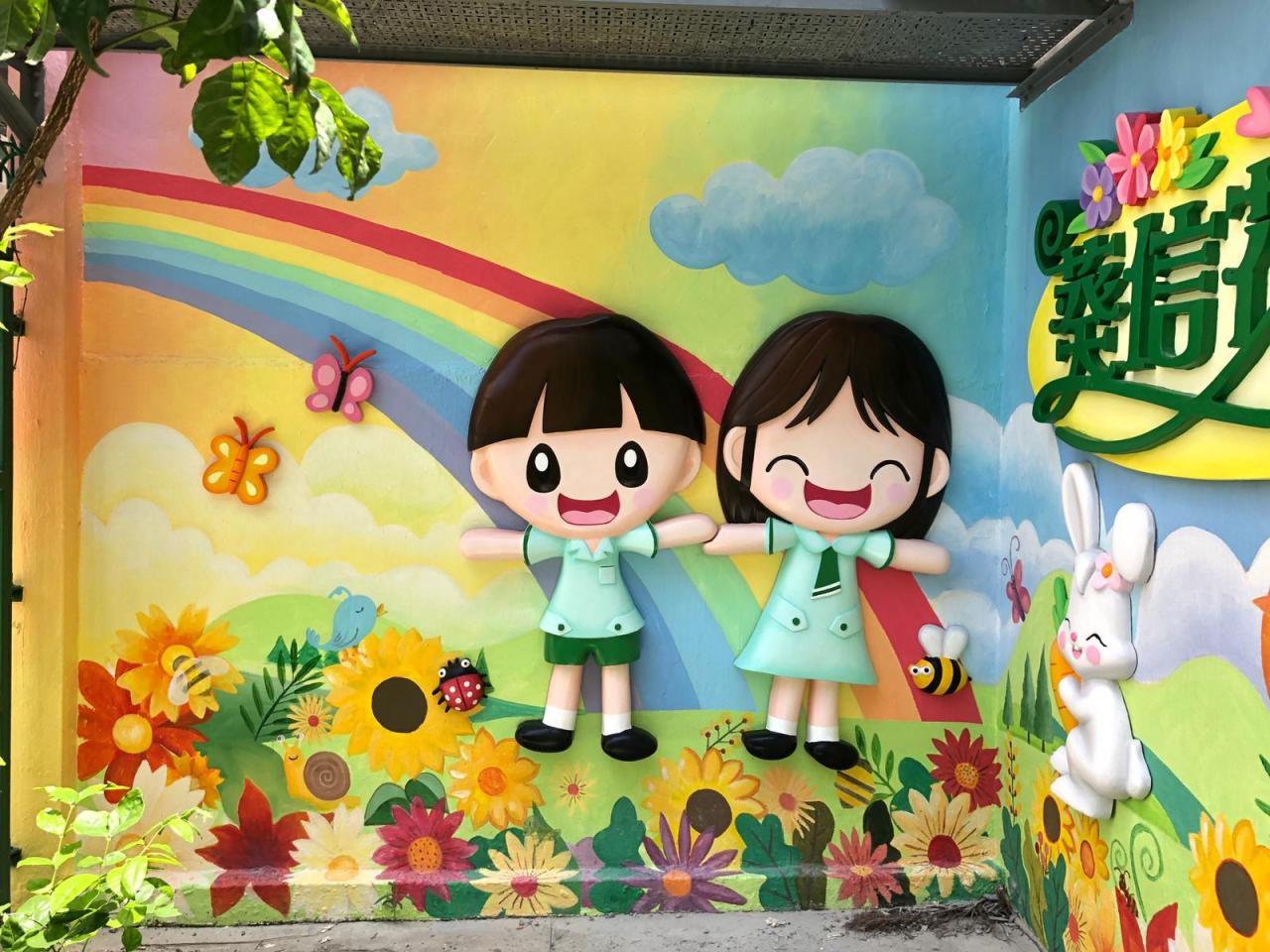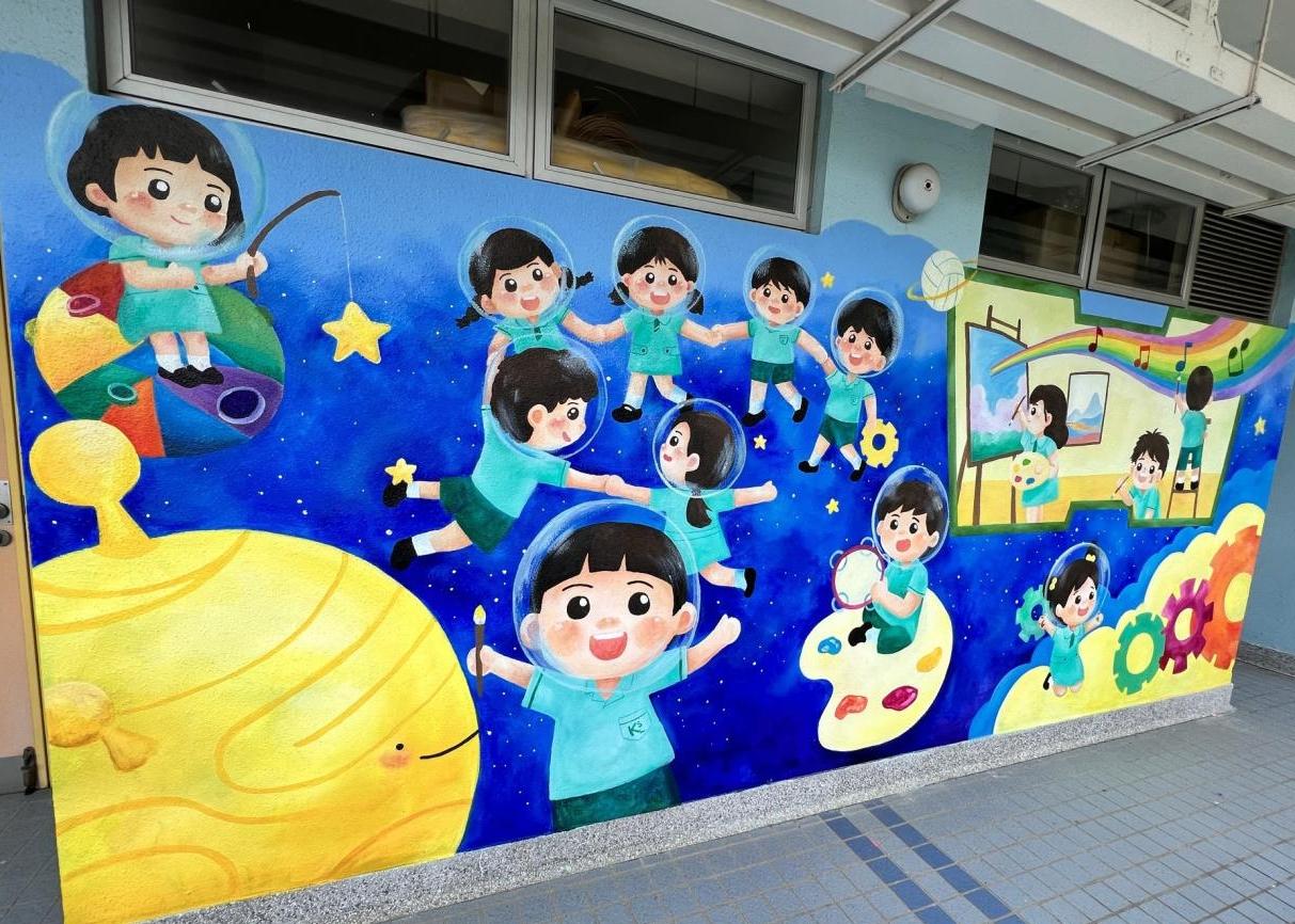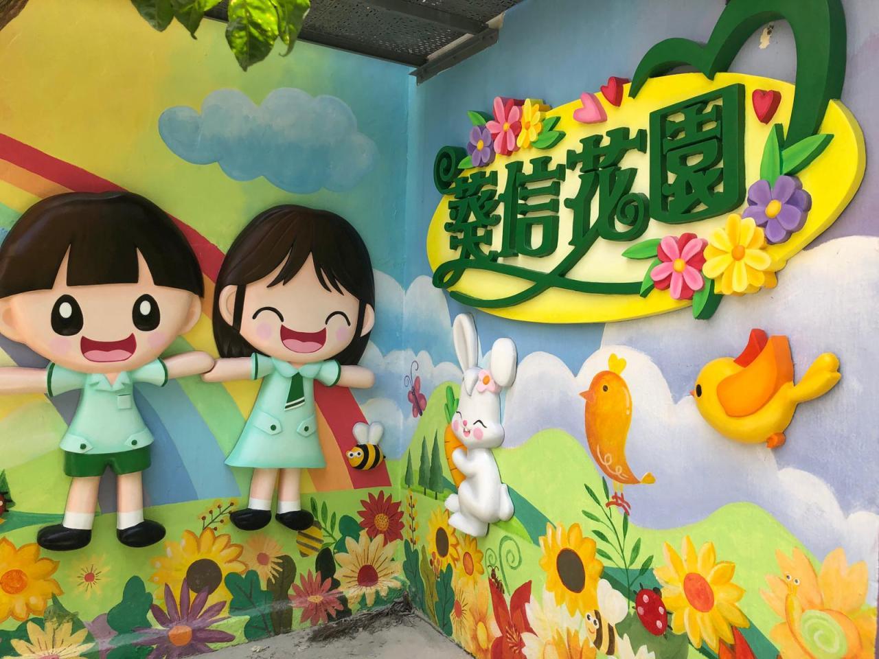 本校小花園已油上新的牆畫及加裝立體浮雕,洋溢著愉快學習、開心校園的氣氛。